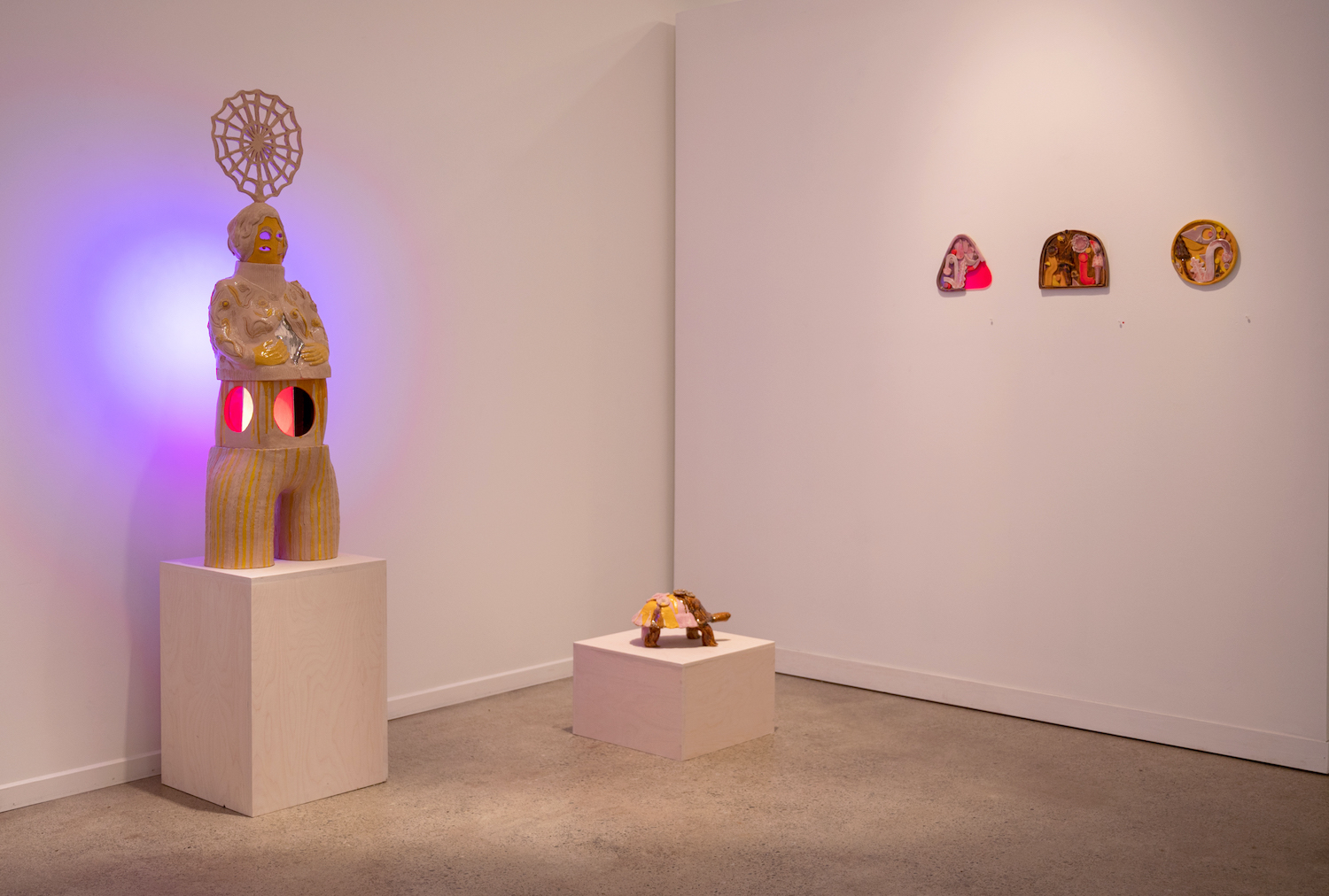 GHOST. Her hands melt into her hips as she dons a power pose in her red power suit. Her features are mixed up like in a dream, a mouth where there should be an eye. A light glows between her legs and eyes, her body expanding beyond her hard ceramic form. Ghost Power Suit is one of a series of ceramic bodies, each with their own personality and specificity, within Counts’ new series. Some people think that spirits live on through our memories or through the objects left behind. For others, ghosts visit in dreams, in the slippery spaces between sleeping and waking. With her illuminated, supernatural forms, Counts invites all possibilities and definitions of “ghost.”