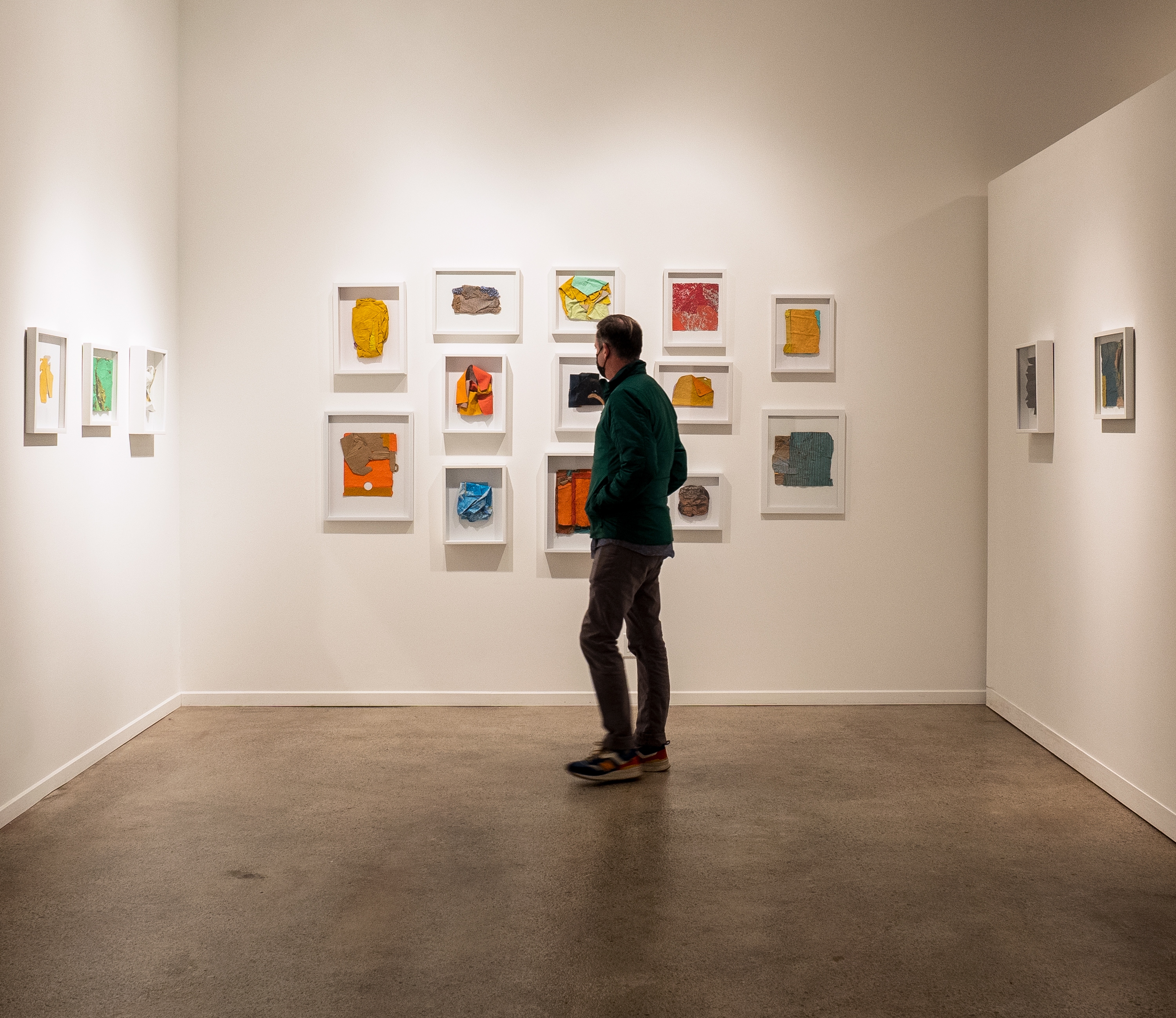 There is a certain kind of magic in the process of collage-making, when the original purpose of what is becoming a collaged fragment is lost and found as something radically different. In her relief collages, Gillian Theobald follows this course of transformation, taking it further by using material that has already suffered its own destruction: single-use packaging, whose loss of use implies a tentative loss of meaning. This starting condition underwrites both the abstract and the three-dimensional nature of Theobald’s pieces. In more traditional collages, incongruous fragments of diverse yet recognizable origin would integrate and disintegrate, generating a space of multiple meaning. Theobald’s collages appear to be solid abstract objects in their own right, offering a certain singularity of expression and reading. Their there-dimensional form is dictated by the waste paper and cardboard material, making the collages intriguing in their ruin-turned-art esthetics. As a unique amalgamation of repurposed material, each collage-object possesses a visceral, expressive energy. Volume plays an important role here, being folded and unfolded by shape and color—Theobald’s color palette is striking in her choice of saturated pigments, and intrinsic to the dynamic dialogue between the shape and the material of each piece.